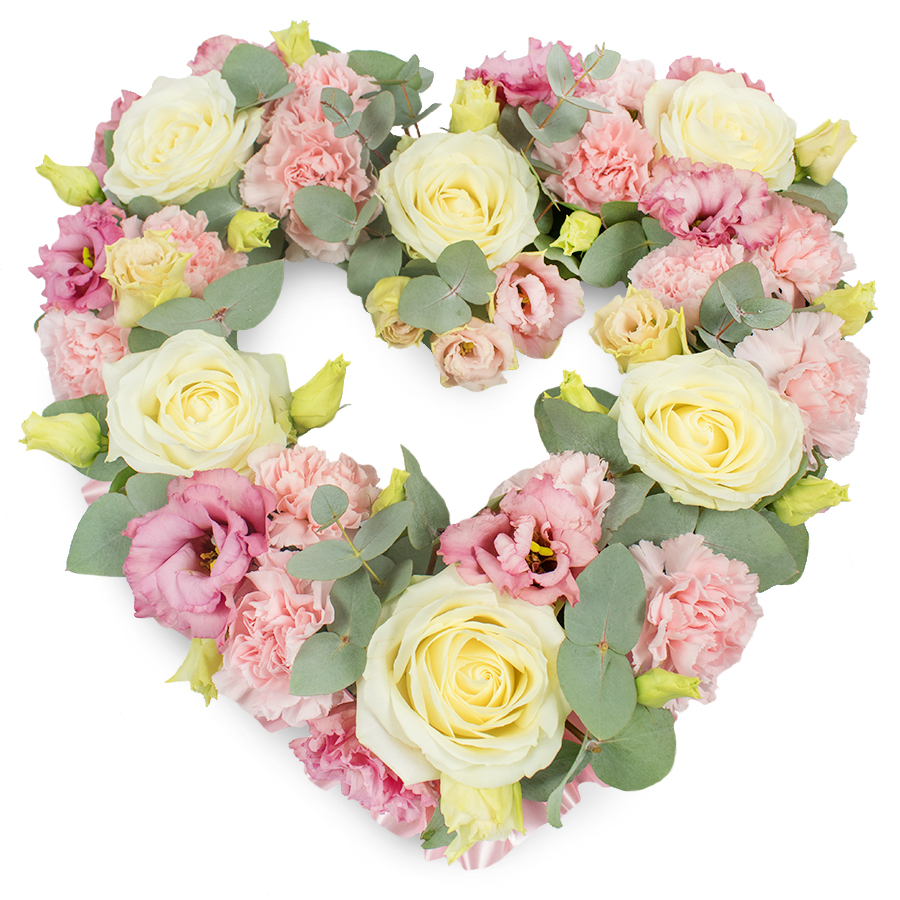 Honor the memory of a loved one with our Refined Open Heart Memorial Bouquet. This sophisticated arrangement features pristine white roses, tender pink carnations, and elegant pink lisianthus, all beautifully combined with soothing Eucalyptus leaves.